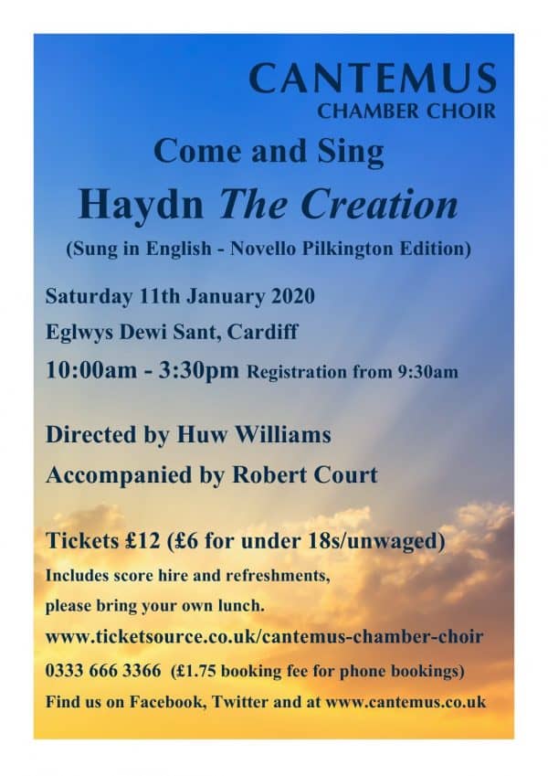 Come and join Cantemus and our conductor, Huw Williams, for a stimulating and enjoyable day of music-making, singing Haydn’s masterpiece, The Creation.